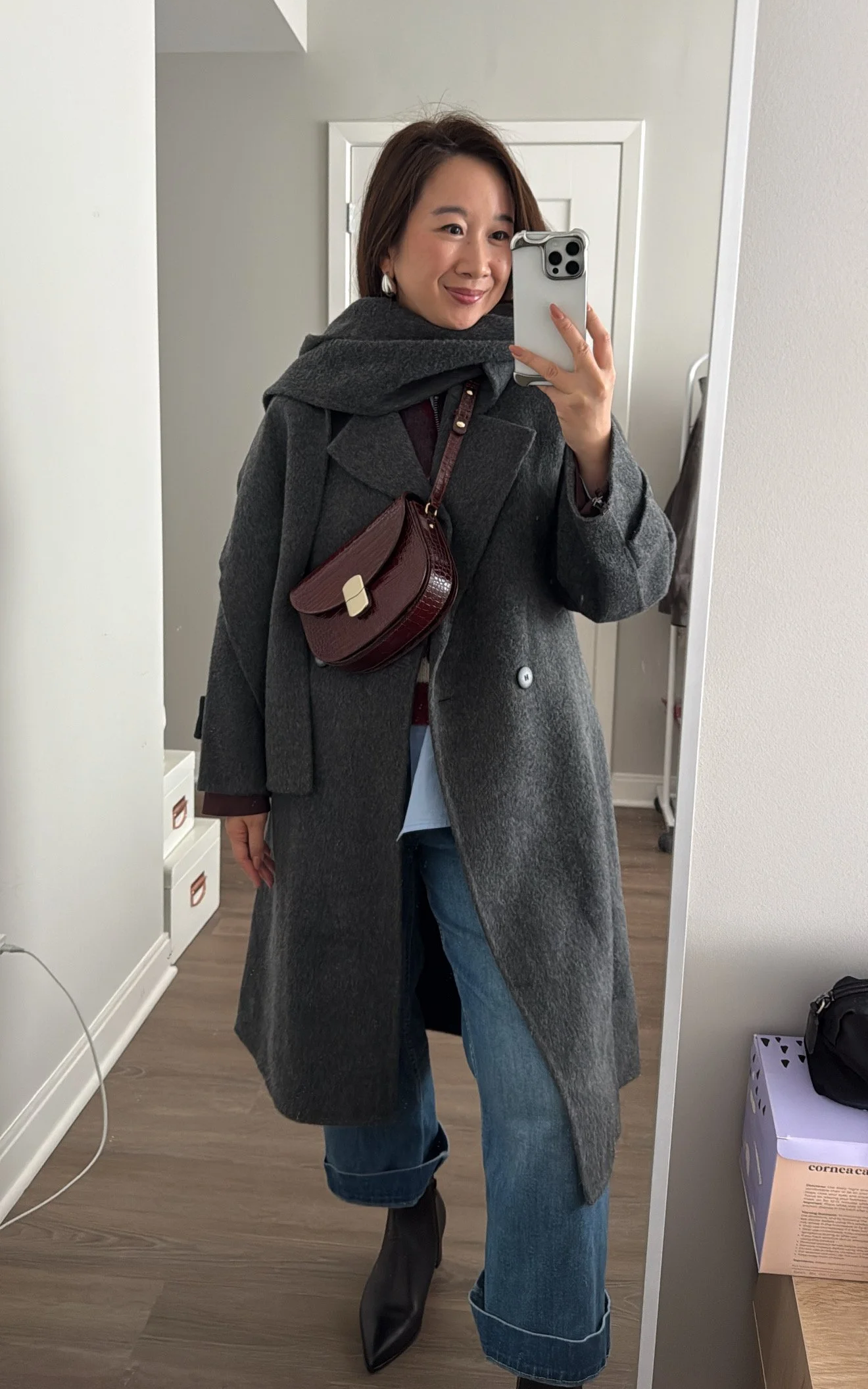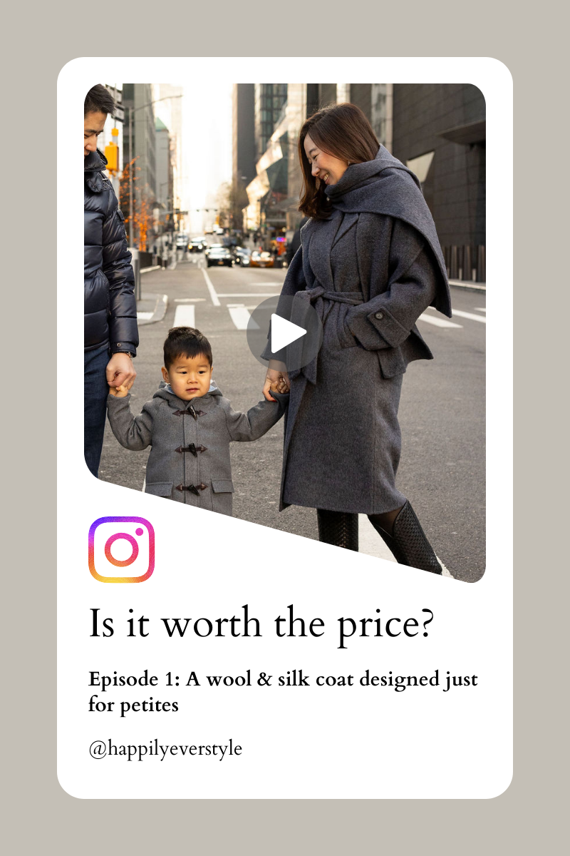 What makes this coat unique is that it’s designed specifically for petite frames. I’m 5’3” (or about 162cm), and I often find that most coats, or the sleeves, are too long for me. I think the fit itself elevated the entire look. This style comes in two colors, charcoal gray and chocolate brown.